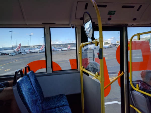 Mittlerweile tauchen auch die ersten Busse auf, also werden wir wohl gleich boarden.