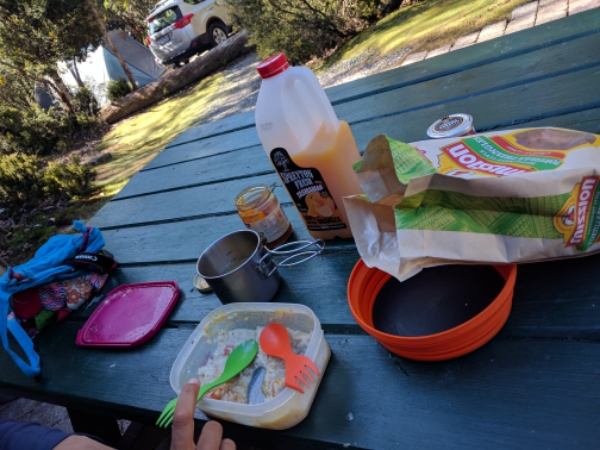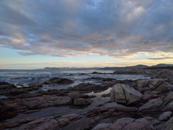 Heute früh haben wir noch Camping-Pancakes gemacht und ein Bier geschenkt bekommen. Danach ging es dann 4 Stunden lang einmal quer über die Insel an die Ostküste, zur südlichen Bay of Fires, in die Nähe von St. Helen.