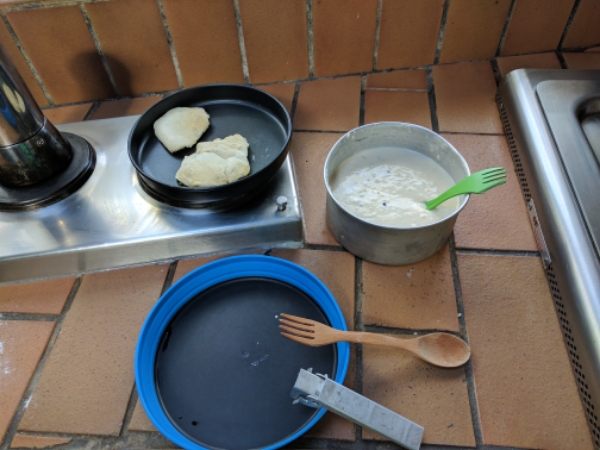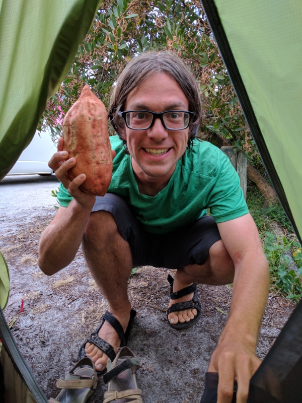 Jetzt sind wir eben um 17 Uhr erschöpft wieder am Campingplatz angekommen, trinken den kalten Gipfelorangensaft und kochen gleich erstmal Kokos-Kartoffelsuppe (Wir haben gestern noch einen Beutel Kartoffeln geschenkt bekommen).
